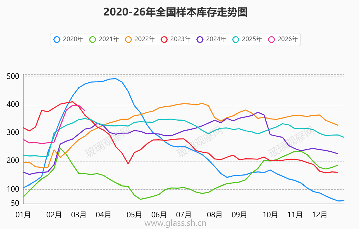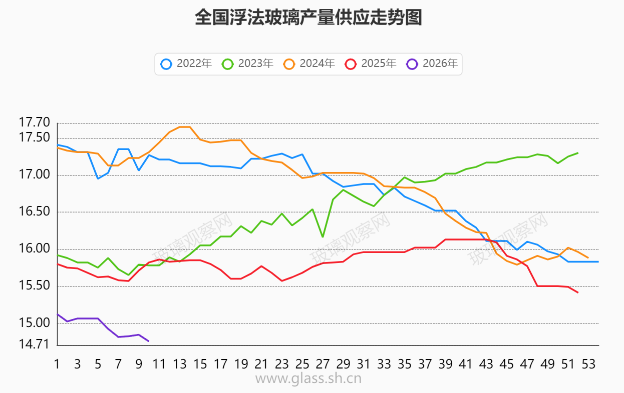 2026年第10周,浮法玻璃上游表需升至17.47万吨日,浮法玻璃样本供应降至14.7万吨日,浮法玻璃厂家总库存开启下降趋势。本周浮法玻璃厂家样本库存7585万重量箱(379.25万吨),环比下降379万重量箱(18.95万吨)。库存水平仍处在偏高水平,环比有所下降。浮法玻璃利润持续亏损,上游生产厂家停产高于复产,全国样本供应持续下降,目前降至14.7万吨日,处于近5年的低点。低供应,高库存,2026年浮法玻璃能否实现价值回归,利润转正,本文将通过供应表需数据分析价格趋势,文中包含2026年上半年周度供需平衡表。