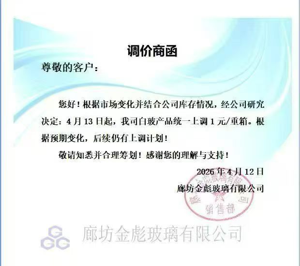 周日廊坊金彪发布涨价通知,计划周一普通白玻上调20元吨。